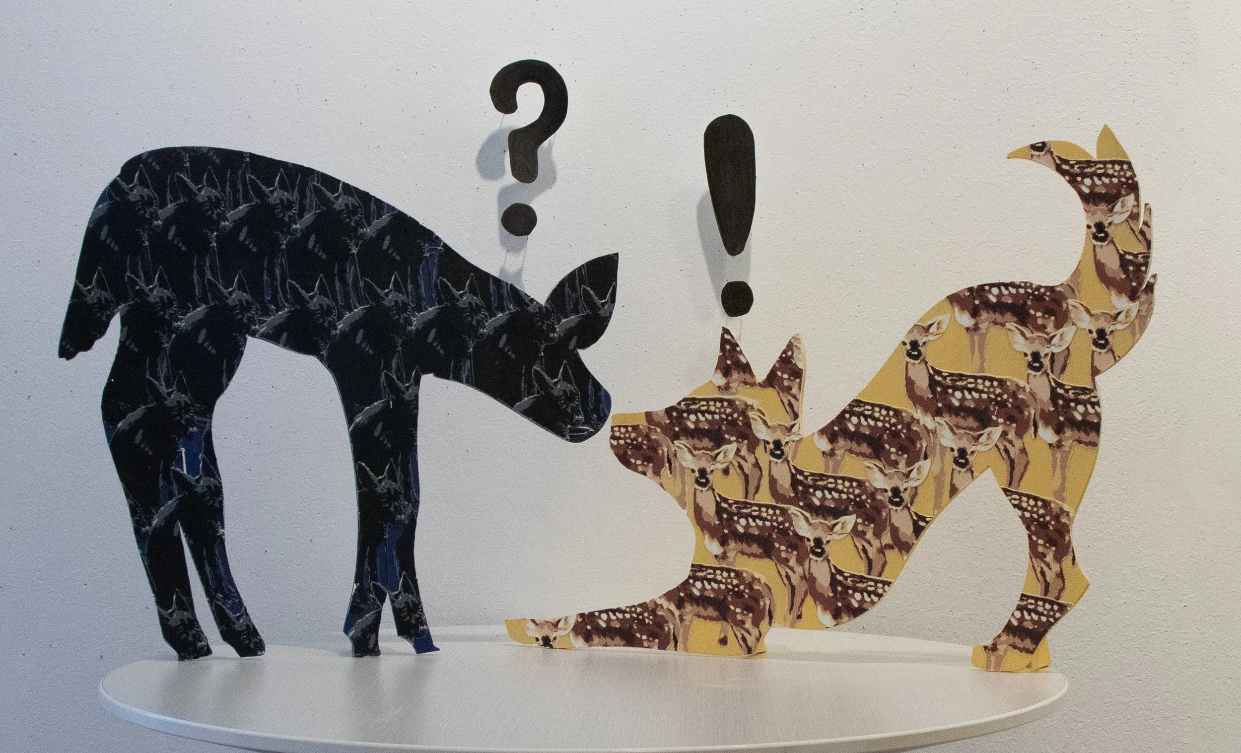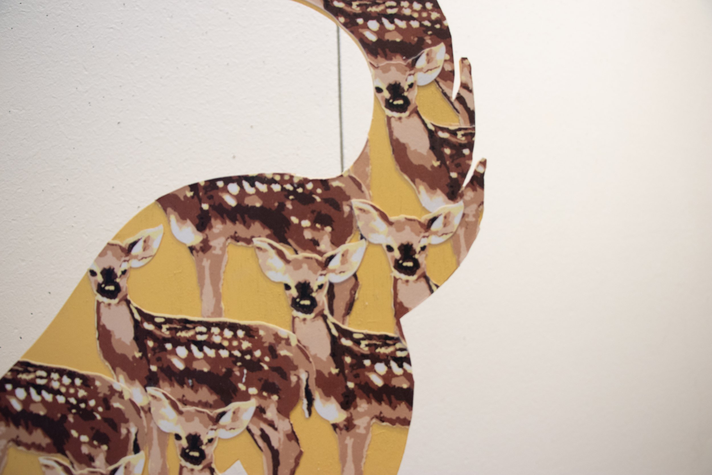 Screenprinted and laser-cut Rives BFK, plywood, spray paint, construction adhesive, acrylic medium, mixed media paper